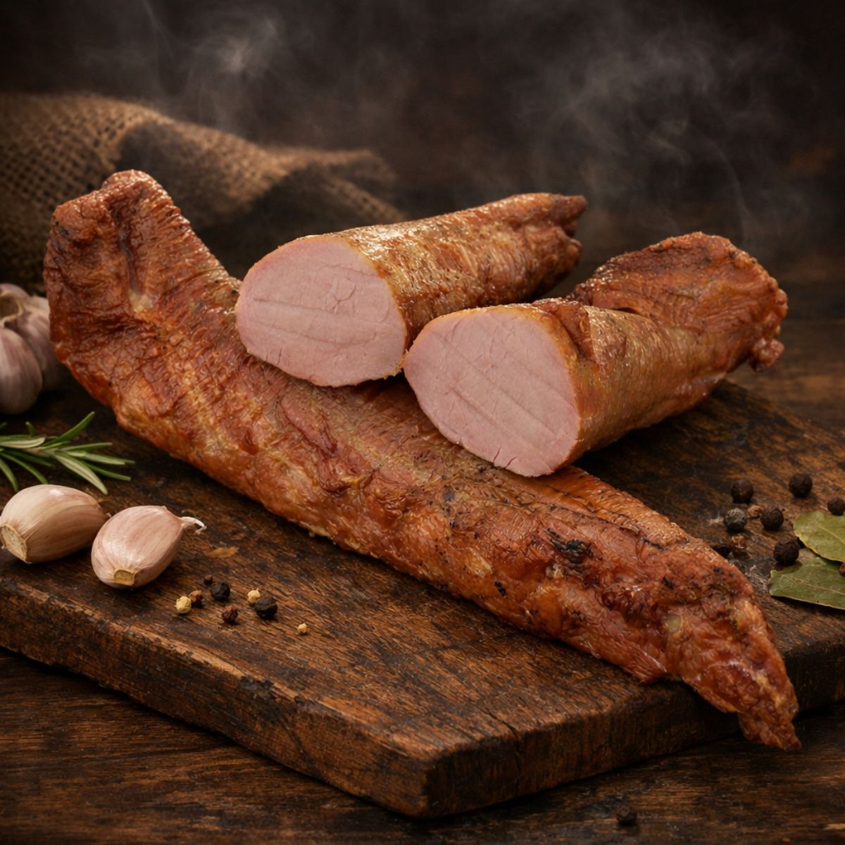 Polędwiczka Wędzona to delikatna, chuda wędlina o subtelnym aromacie, przygotowana z najwyższej jakości mięsa od polskich rolników. Wędzona tradycyjnie drewnem dębowym i olchowym, zachwyca kruchością i naturalnym smakiem.